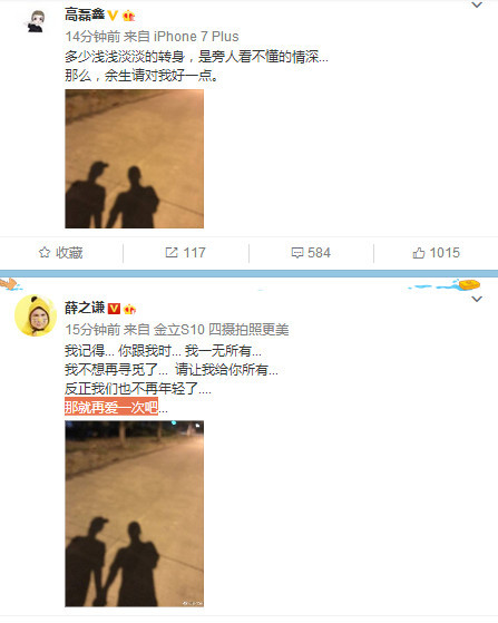 9月8日,薛之谦和前妻高磊鑫一前一后发表微博表明复合,而且顺带秀了一下恩爱。