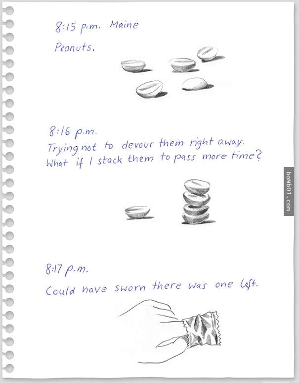2. 下午8:15,缅因州。空服人员发放了一些花生当零食。下午8:16。努力克制不要一口吃完。要不把它们叠起来消磨一下时间?下午8:17。也许裡面还剩下一一颗。