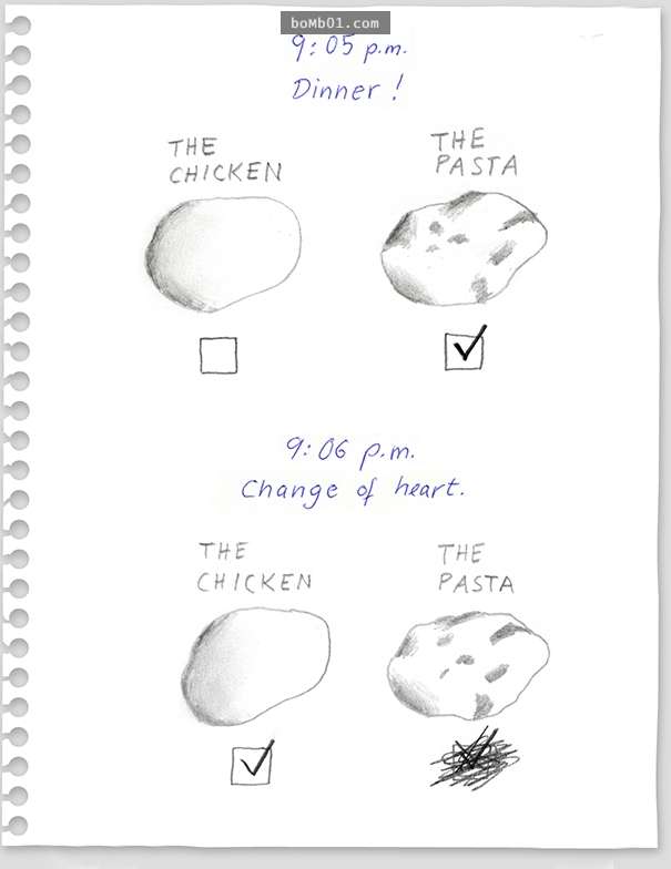 3. 下午9:05,晚餐时间。没有选择鸡块,而是选了义大利面。下午9:06。改变主意了,还是鸡块吧。
