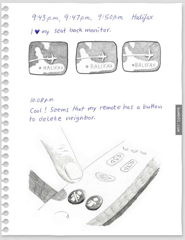 5. 下午9:43、9:47、9:50,加拿大哈利法克斯。我爱座椅靠背上的小萤幕。下午10:08。真是太酷了!我的遥控器上好像有个按钮,只要按下去就能让邻座的人消失。