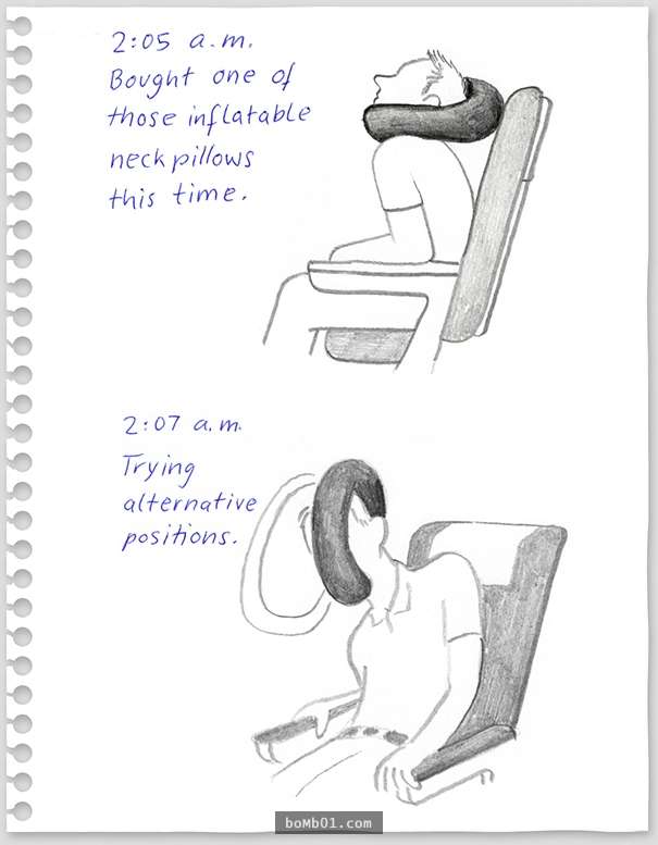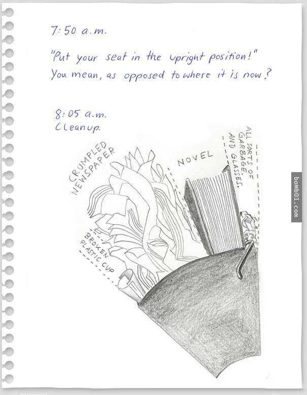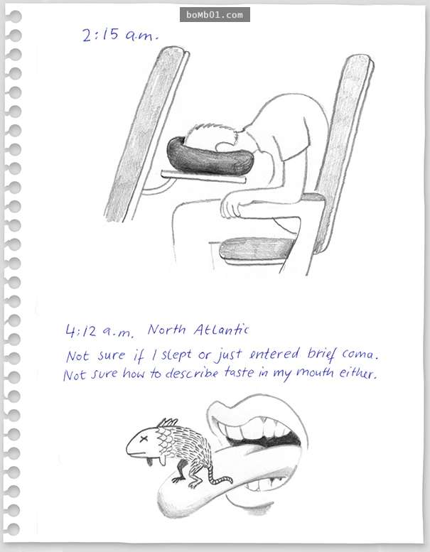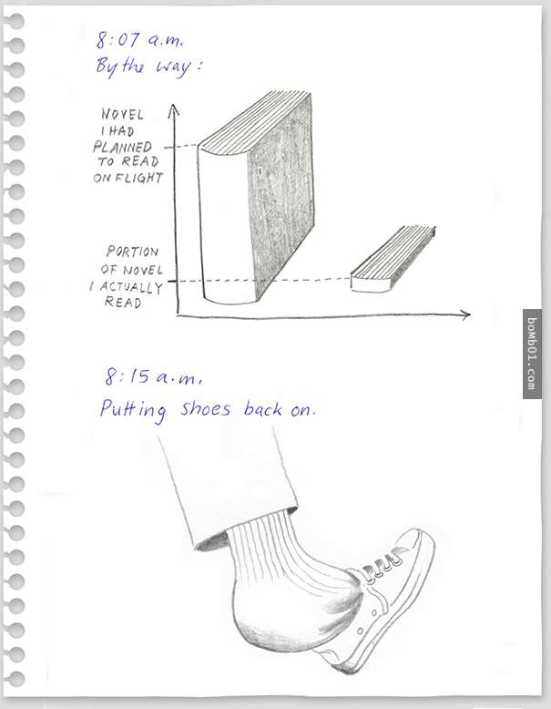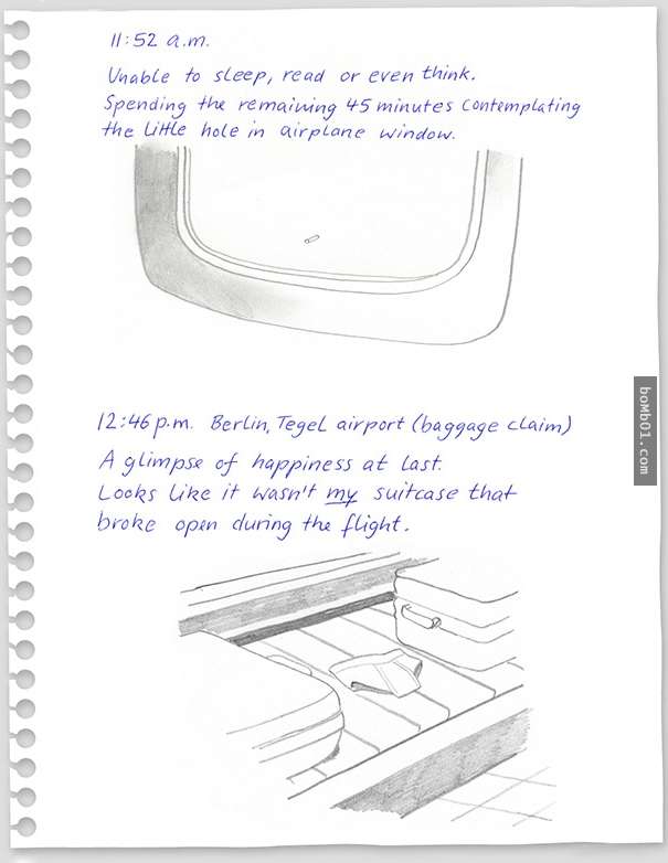 艺术家尼曼(Christoph Nieman)用幽默的笔触画下了自己经历的一切。早早起床,提前一小时来到机场,通过安检进入机舱坐好后,「噩梦」才真正开始。