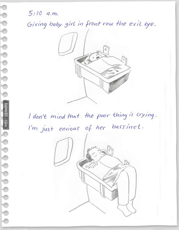 8. 早上5:10。恶狠狠地看前排的婴儿。我才不管他是不是在哭呢,我只是嫉妒他能躺在篮子裡。