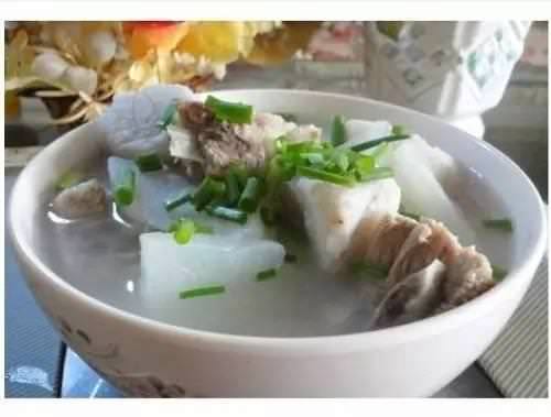 4、倒入汤锅,把浮沫除去,放萝卜;5、再20分后放盐。