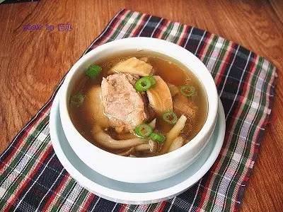 原料:排骨2根,茶树菰适量,淮山适量,党参适量,枸杞子适量,盐适量