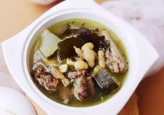 原料:冬瓜80克,薏米50克,水鸭250克,清水1400克,生薑10克,青葱15克、盐5克,鸡精3克,糖1克,胡椒粉1克。