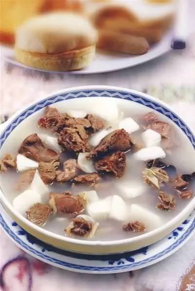 2.将羊肉放进瓦褒内,加桂圆、杞子、淮山、红枣,注入清水,武火煮沸后再改用文火煲3小时,下盐调味即可食用。