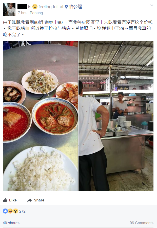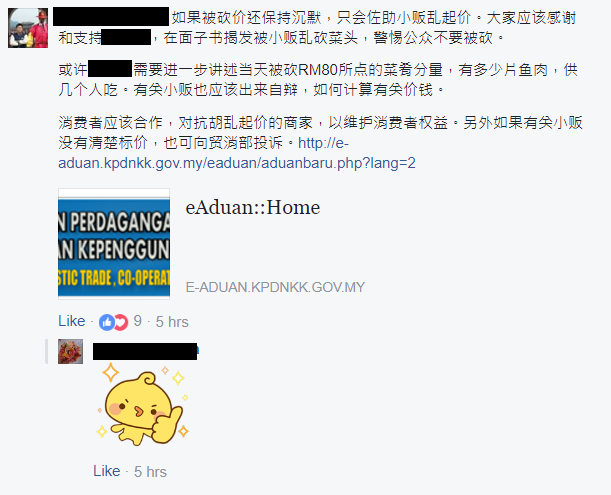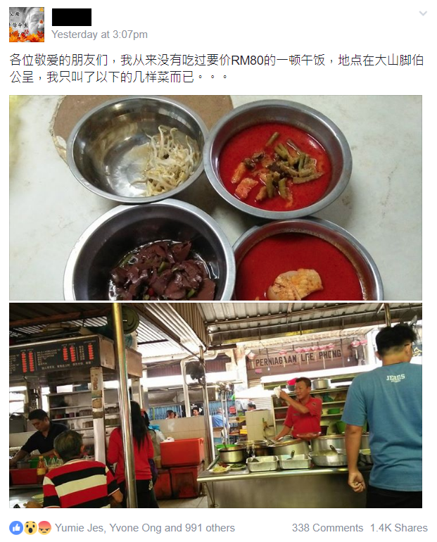 昨日一位女士在面子书发帖讲述她在槟城大山脚伯公呈某经济饭档口叫了图片里的4样菜既然被收 RM80!此贴马上得到了很多当地人的关注和转发,马上来看看当地人怎么看这件事?