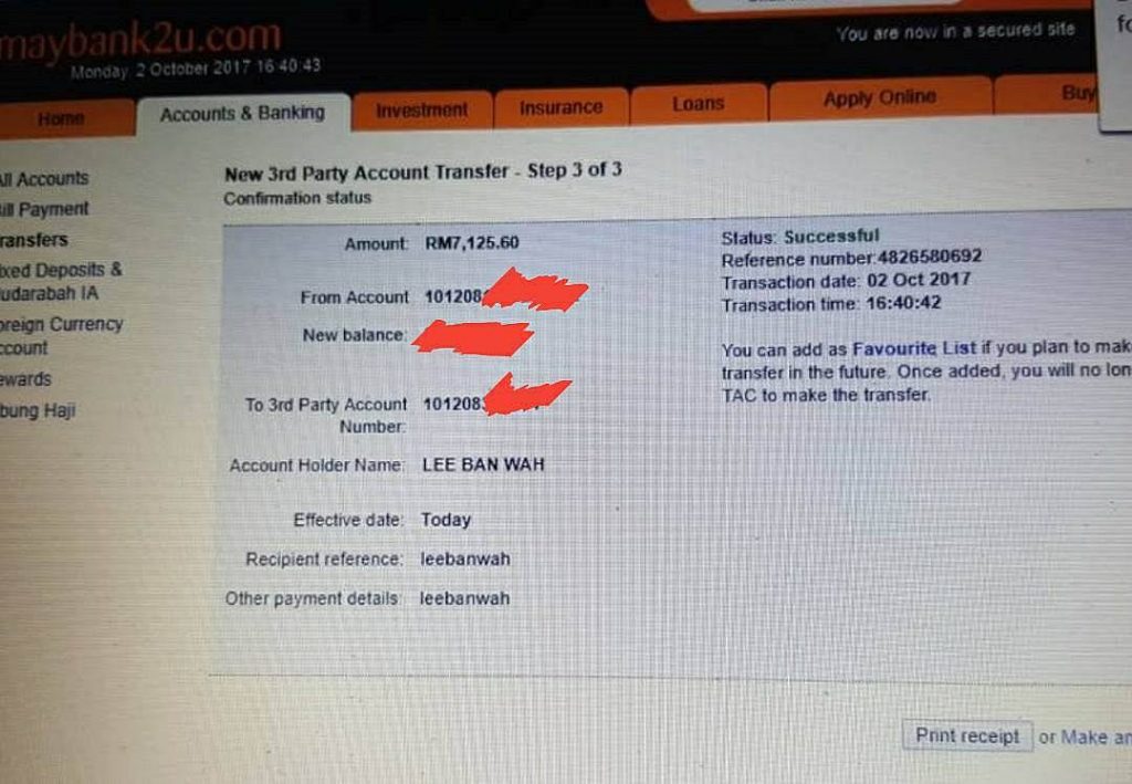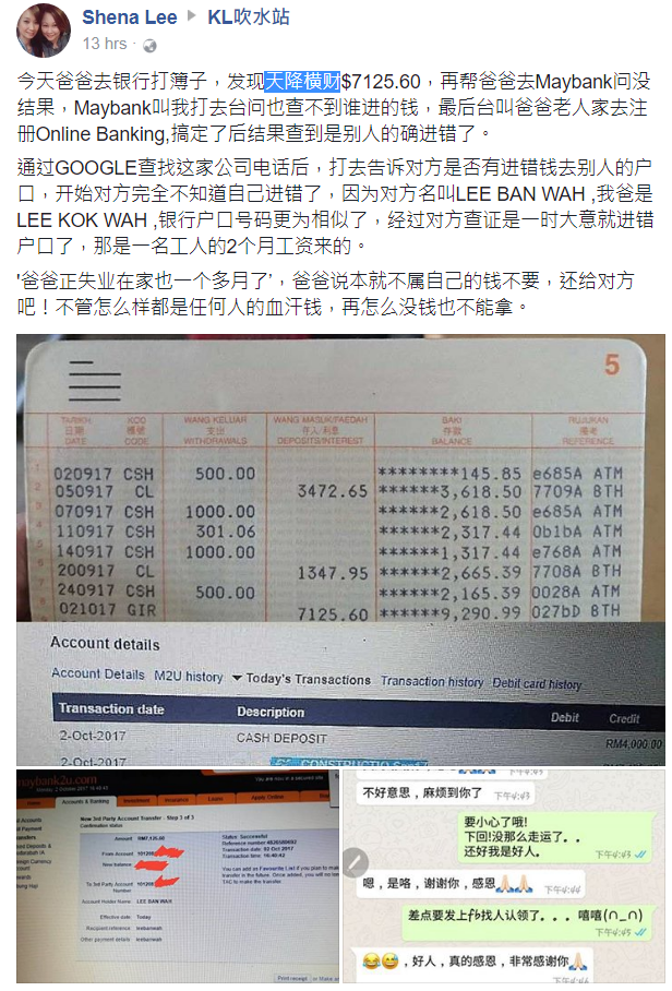 昨日Shena Lee 女士在KL 吹水站发布了这个帖子,原来是摆乌龙银行转账错误转到她爸爸的户口。