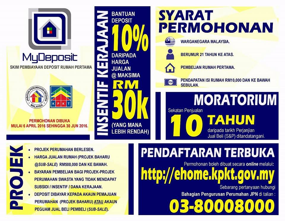 MyDeposit 是政府帮助中产阶级购买房子而推出的买房计划。月入RM 3000 至 RM 10,000 首次买房的中产阶级,将可获得政府支付的10%买房头期或最高3万令吉的辅助金。