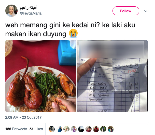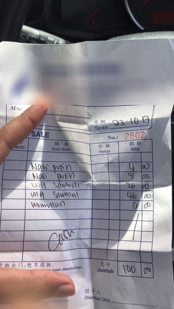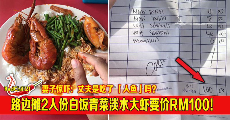 今早社交媒体上疯传了两人在路边摊用餐竟然被收费RM100,其妻子看到单据也大吃一惊,随后她把单据上载到twitter 然后表示 “这间店平时也这样收费的吗?我的老公是吃了人鱼? ”