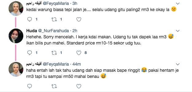 ▼ 其妻子也表示这个是路边摊开的价钱, 而且这类型的虾一般的收费也不过是 RM3 罢了,但有做吃的网友回复RM3 是买不到这虾啦,至少一只要RM10-15。