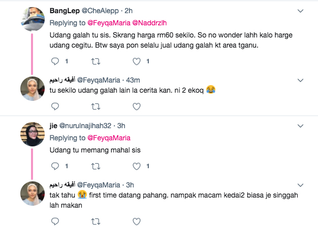▼ 但网友也说图片中的是“Udang Galah” 淡水长臂大虾, 1kg= RM60。其妻子回应说,这才2只就那么贵了!