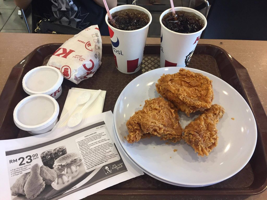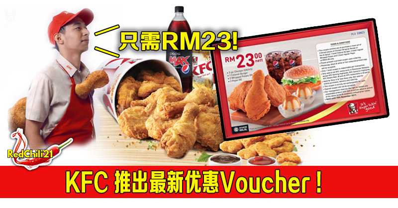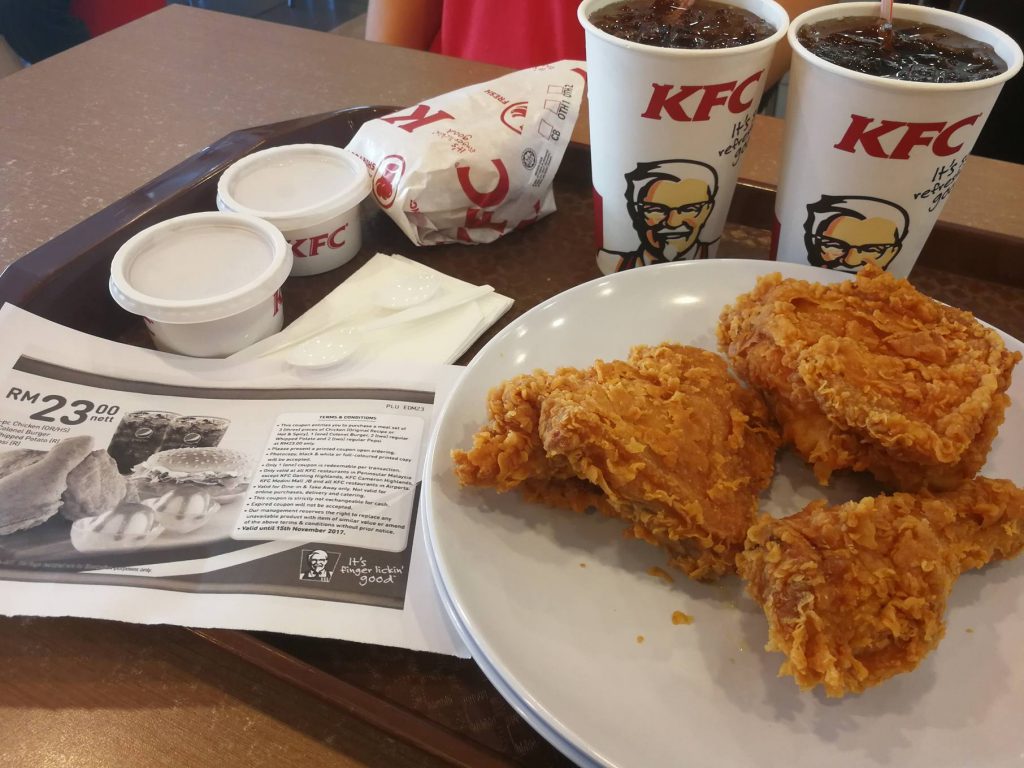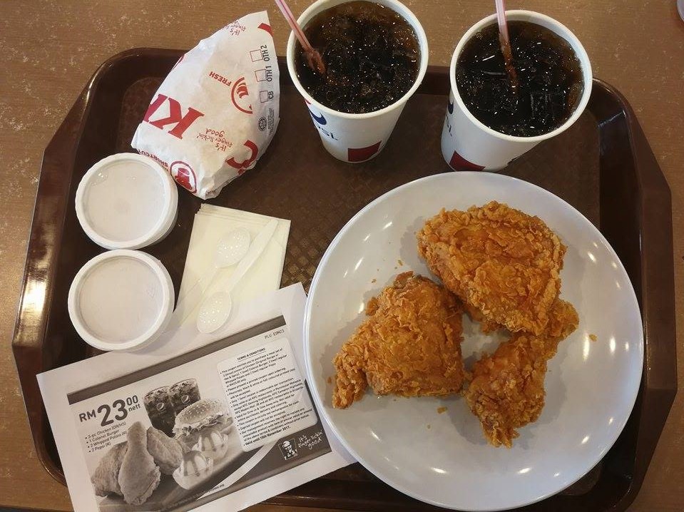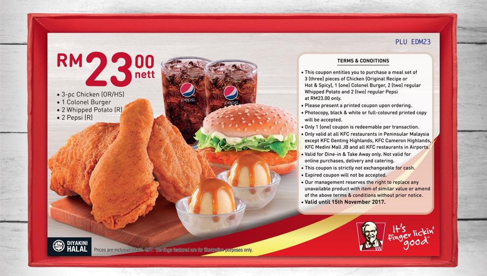 - This coupon is entitles you to purchase a meal set of 3 pieces Chicken, 1 colonel burger , 2 regular whipped potato and 2 regular pepsi at RM23.