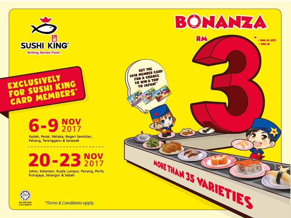 - Promotion is strictly for 2017 Sushi King Member card holder and is valid for dine-in only.