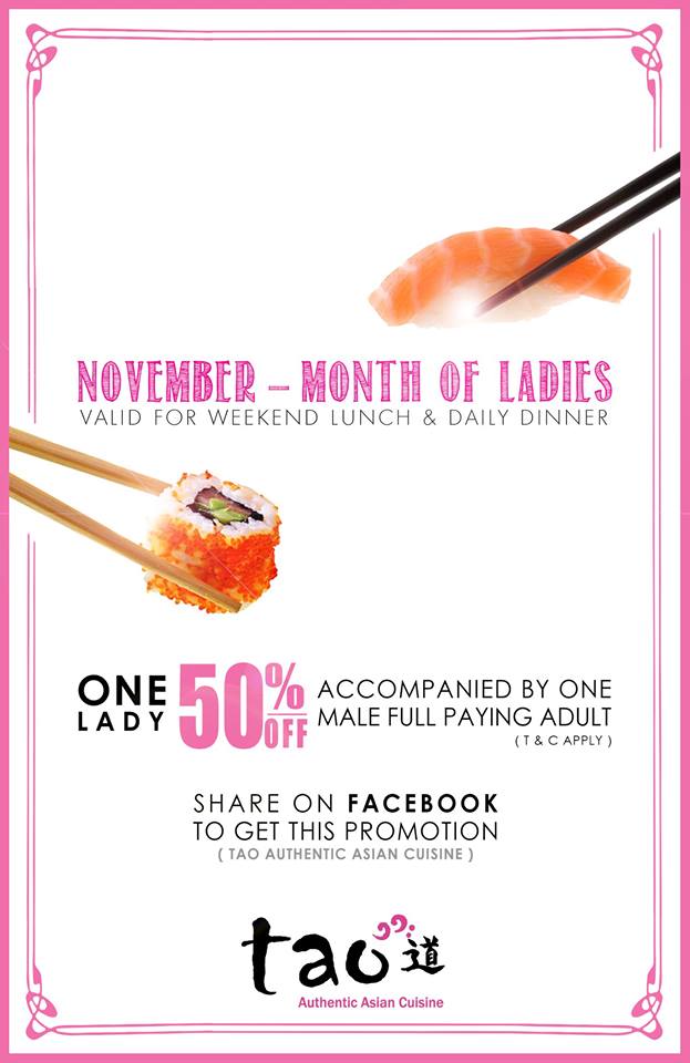 著名Buffet TAO Authentic Buffet 推出特别促销活动!日式Buffet 50%折扣!女性可以在周末享有 Buffet 50%折扣。只要同时和一名男性前往TAO Authentic Buffet 吃Buffet,女性可以享有50%折扣,男性则需付原价。