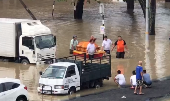 水灾也造成原定于週日上午10时30分进行的举殡仪式被迫延迟,家属更出动四轮驱动车代步,以载送亲属到丧府祭拜。