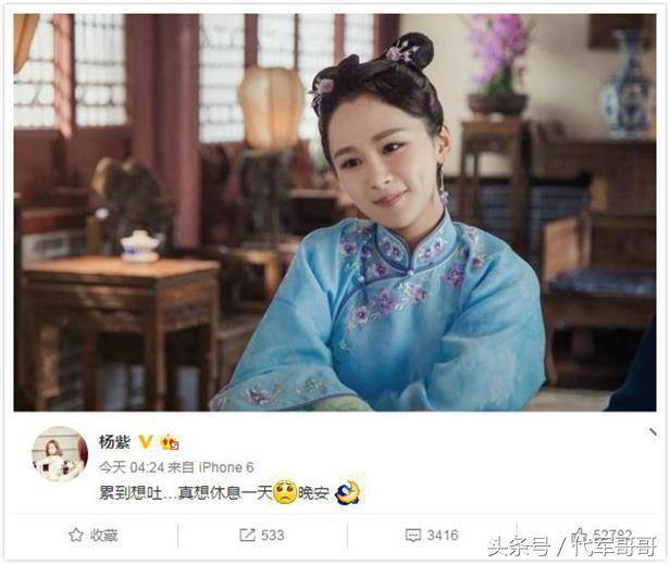 杨紫在《青云志》刚刚杀青便马不停蹄的赶往《龙珠传奇》剧组,三个月拍完《龙珠传奇》又去了《欢乐颂》剧组,自己发文「累到想吐」,这麽密集的安排怎麽可能不累。