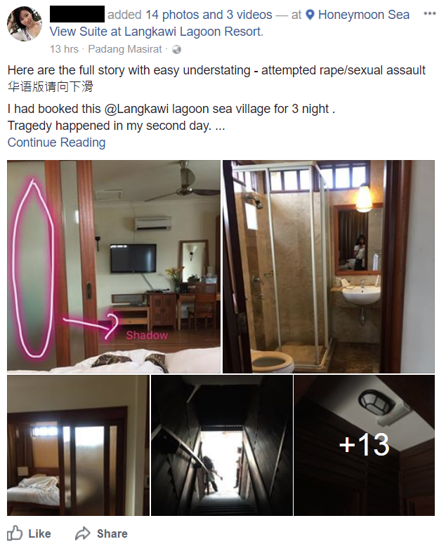 昨日一名大马女子在其脸书分享了这恐怖的经历,就是差点在浮罗交怡 langkawi lagoon sea villa被性侵犯!