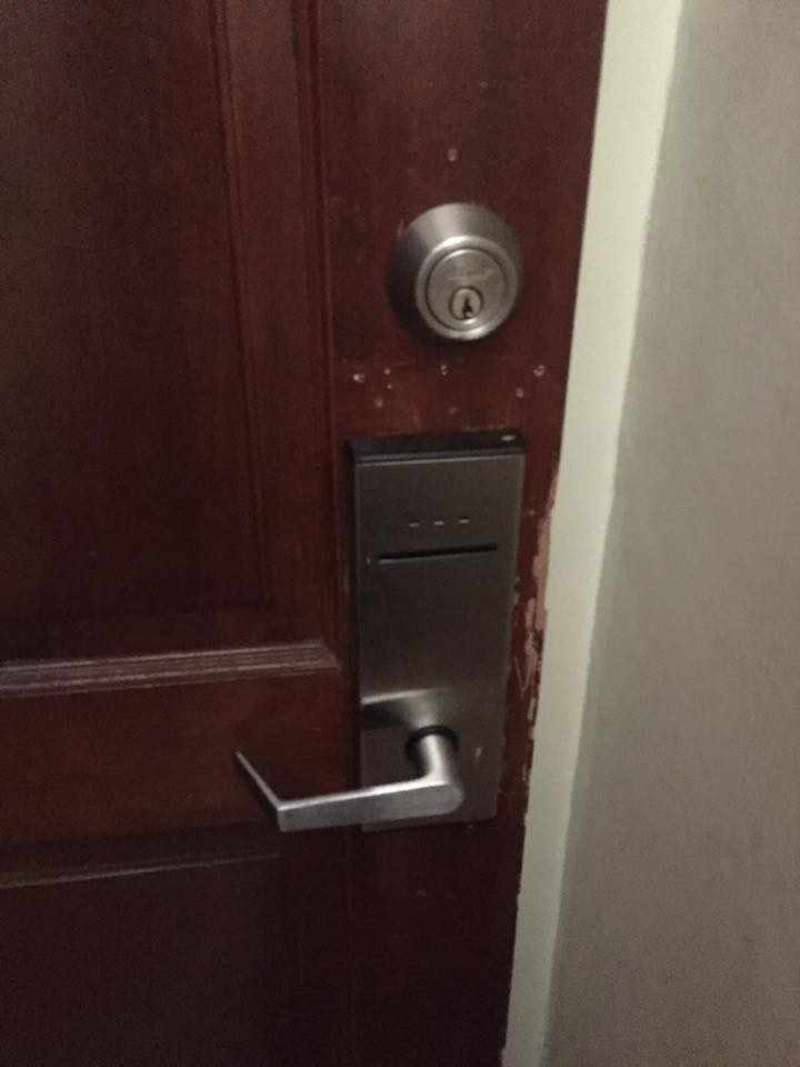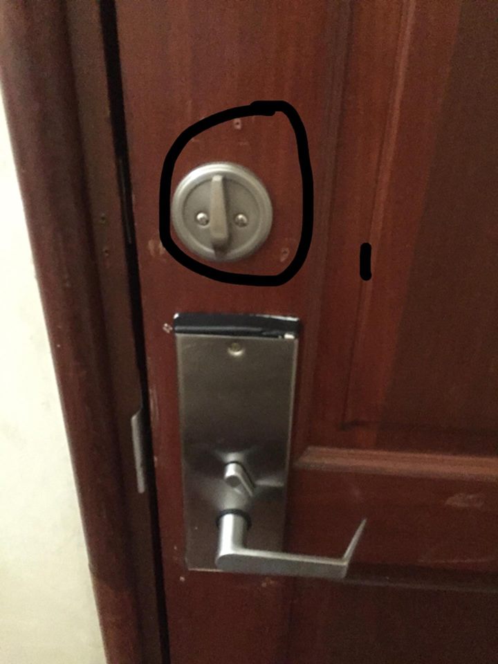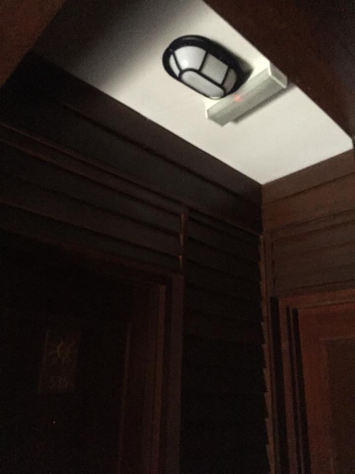 走廊是黑暗的。走道灯不起作用。只有一个锁可以通过主密钥锁定和解锁。