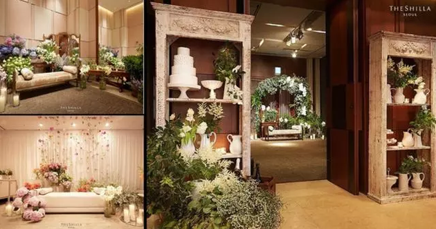 据该饭店的SNS介绍,迎宾馆的新娘休息室是象牙色、浅粉色背景,散发着淡淡的优雅气质。 新娘坐的沙发旁边和后面有各种各样的鲜花,除了婚礼场地充满了桔梗花表达两人爱的誓约之外,新娘休息室看起来也超浪漫。