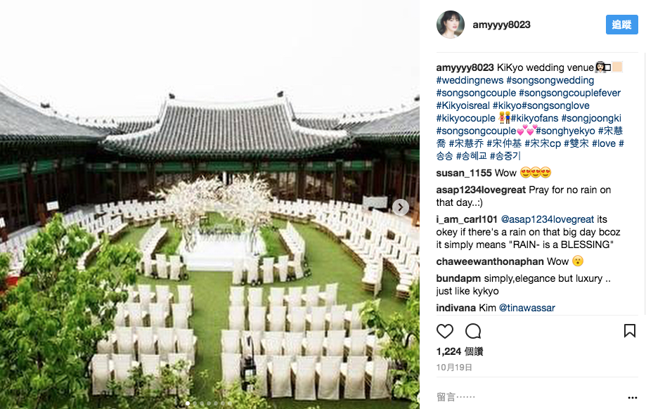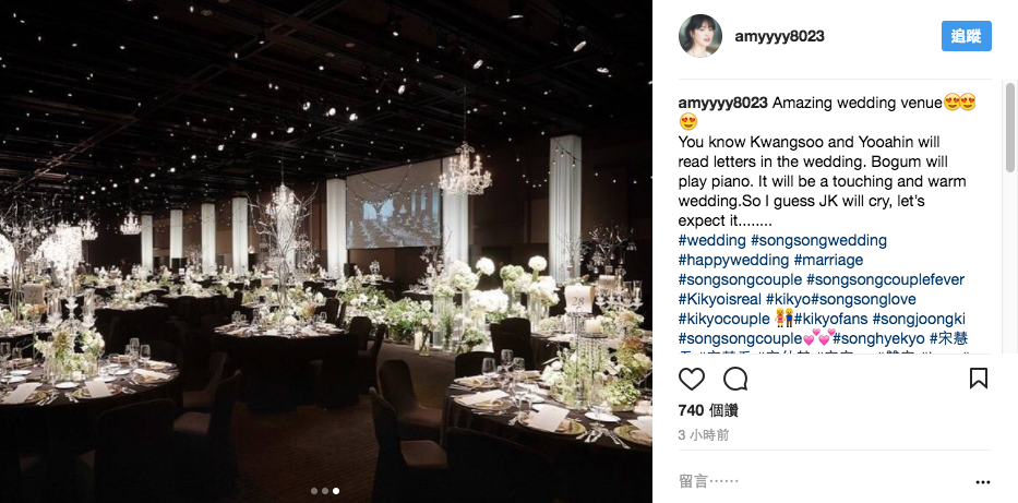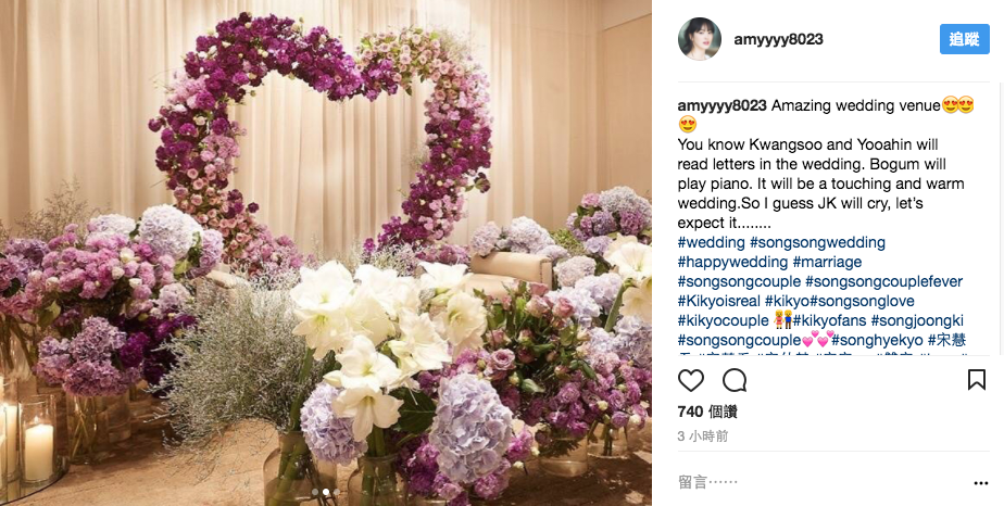 双宋在新罗饭店的迎宾馆举办婚礼,虽然事前就宣布会低调进行,不开放媒体采访,但30日仍可见到许多游客入内参观,饭店人员也未加以阻拦,工作人员则是在门口架起白色背板、架设树木枝叶,还在屋檐及场地中央挂上满满灯泡,且布置选用的主要花材则是桔梗花,花语是“永恒的爱”。