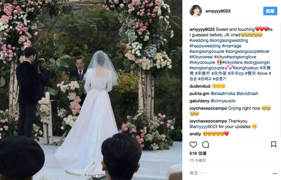 ▼ 宋仲基牵着乔妹入场,之后念誓词,乔妹更数度感动到落泪。宋慧乔这次挑选了露背白色婚纱更凸显女神气质,不过照片中乔妹身形圆润令外界质疑有孕,希望一对新人有好消息尽快向粉丝宣布吧!