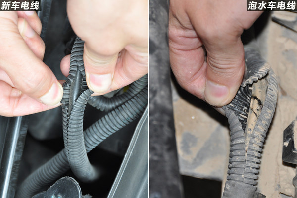一般被水淹过的车子,电机电线都不会更换,也不会费力去清洗,因此只需掰开检查线束,就能发现里头是不是有污泥的痕迹。