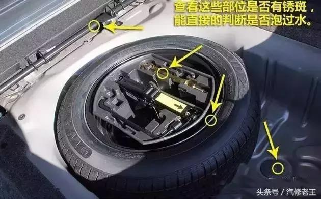 2、检查车辆内外部各装配件之间缝隙:打开任何车内能打开的地方,如手套箱、后备厢的饰板、检查备胎和随车工具等,一旦发现车内任意地方有水渍和淤泥,那基本就能判断这是辆水泡车。或者通过备胎和随车工具也能判定,一般备胎轮毂都是铁质轮毂,防锈处理也比较简单。如果轮毂和随车工具有比较大面积的生锈,这也是泡水的证据。