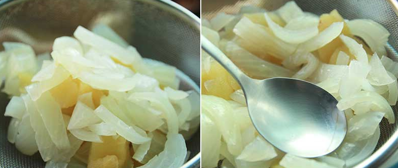 做法:洋葱去皮洗净,切片后用微波炉加热2分钟。苹果连皮去核切成适当大小,加入洋葱块,然后一起蒸。蒸好后加入蜂蜜就可以享用了。