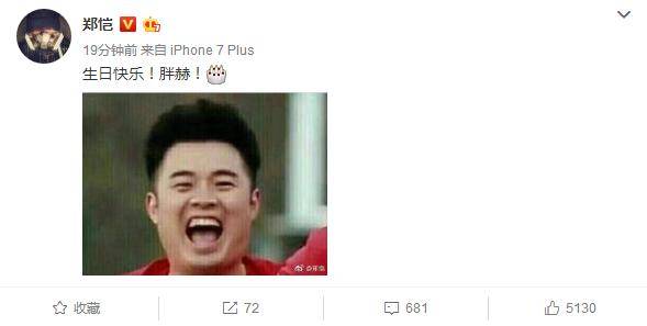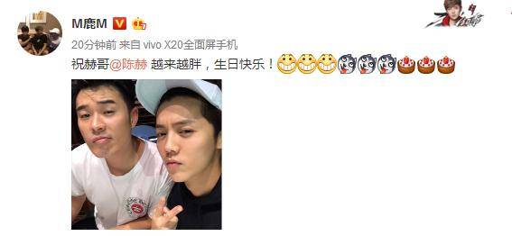 照片中两个搞怪但是很有型,但是鹿晗的祝福亮了,其他人是祝陈赫减肥成功,而鹿晗则是祝「越来也胖」,这裡小编不得不说,还是鹿晗了解陈赫,知道减肥对赫宝宝来说几乎不可能,那就果断的快乐的吃起来吧。