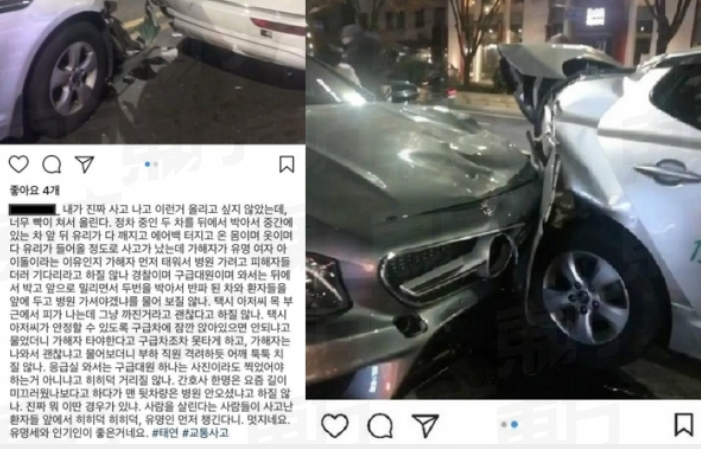 江南警察局则表示送医的驾驶与乘客并非重伤,也针对太妍做了酒精测试,并非酒驾。