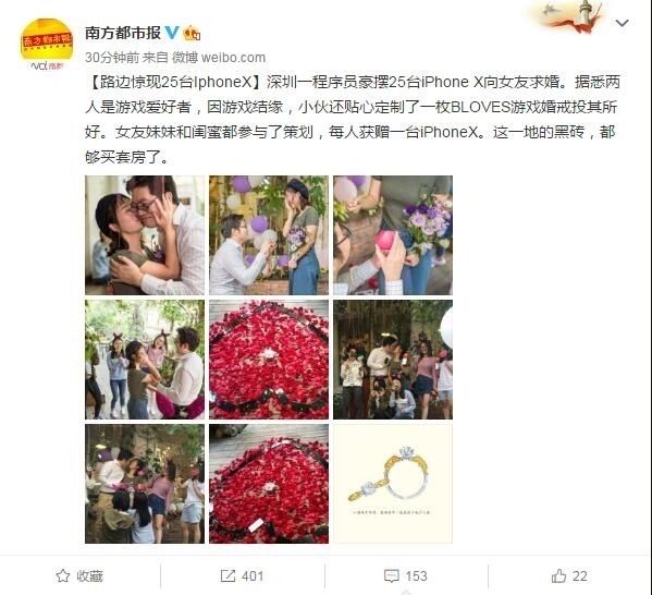 一支iPhone X售价近人民币万元,一般人买一支都要考虑再三;深圳一位程式设计师,居然一口气买了25支摆在地上围成心形向女友求婚,求婚成功后把这些iPhone X送给女友的闺密,每人1支。