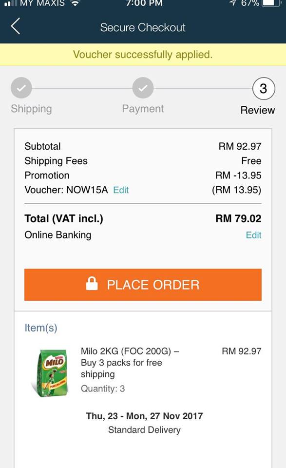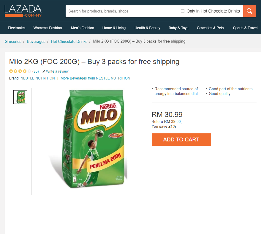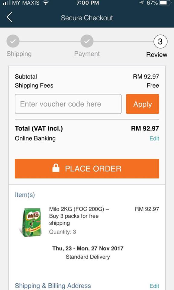 现在机会来了咯,只需要上到 Lazada Mobile App 上购买3 包milo 就能得到 Free Shipping 了!! 【链接】