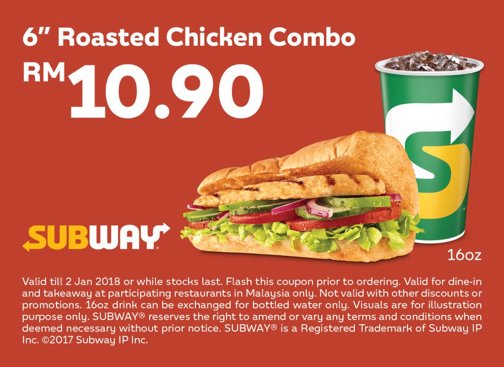 这次的折扣券包括以 RM 10.90 的优惠价格购买 6” 的Spicy Italian Combo、Roasted Chicken Combo、Tuna Combo、Turkey Breast & Chicken Slice Combo、Chicken Teriyaki Combo、Italian B.M.T. Combo,以及免费的咖啡 / 茶!