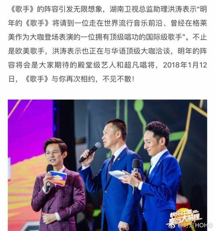 《歌手2018》新的一季阵容豪华,传出除了天后张惠妹,还有逃跑计划、张韶涵、华晨宇、汪峰、杨千嬅,更令人惊讶的是,还有英国流行歌手Jessie J,第一集将于1月3日录制,1月12日晚间10点播出。