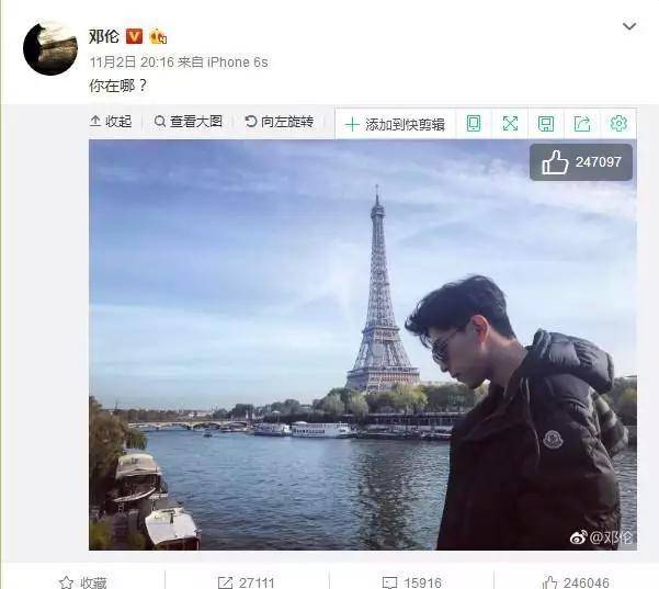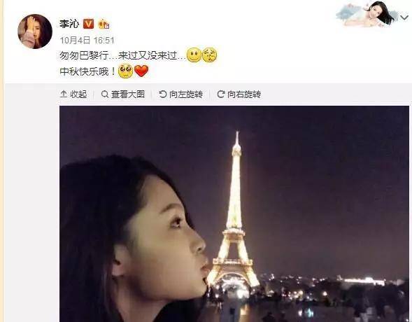 两人之间不是没有端倪的,在10月份李沁就发过一张在巴黎艾菲尔铁塔前的照片。