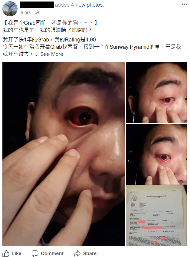 但是我希望借助网民的力量给他们施加压力,让他们出来道歉!我们做Grab司机的,也是有尊严的!你拿钱丢我,算什么?你这样打我,如果我瞎了是不是你负责?