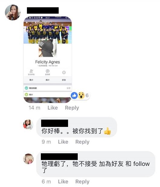 我就跑去找我一个很厉害网络的朋友帮我查。就发现原来这个打我的人,很可能就是马来西亚女子Futsal国家队代表!很嚣张!怎么能打人的眼睛呢?名字好像是 Fexxxity Axxxs.