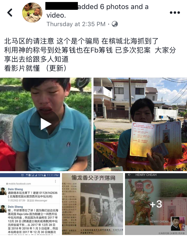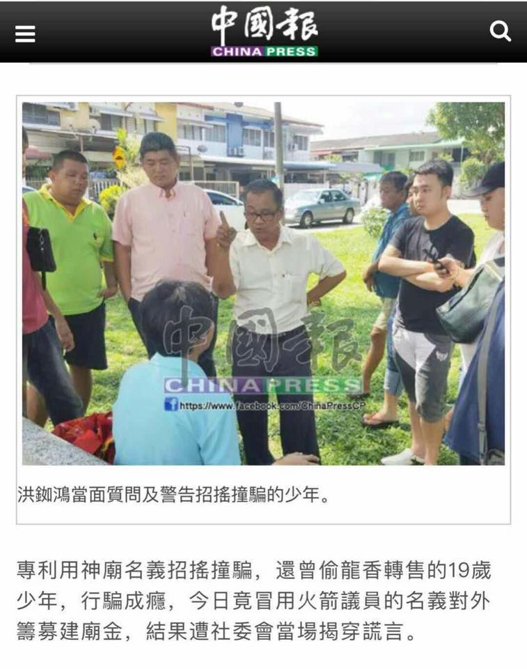 日前,面子书上有网友分享了一位19岁青年冒用神的名义来招摇撞骗而被当地人揭穿后被教训一番。此贴文上载后引起了当地人的关注,至今已有5,348网友分享。