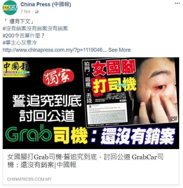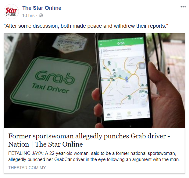 昨日在社交媒体上闹得沸沸腾腾的Grab司机被大马国家队选手挥打一拳的事件被媒体们报道了双方最后和解,也因为这些和解的报道让网友们攻击Grab 司机。但晚间10点多左右,Wayne Chow 再次发帖他肯本没销案也没接受和解。