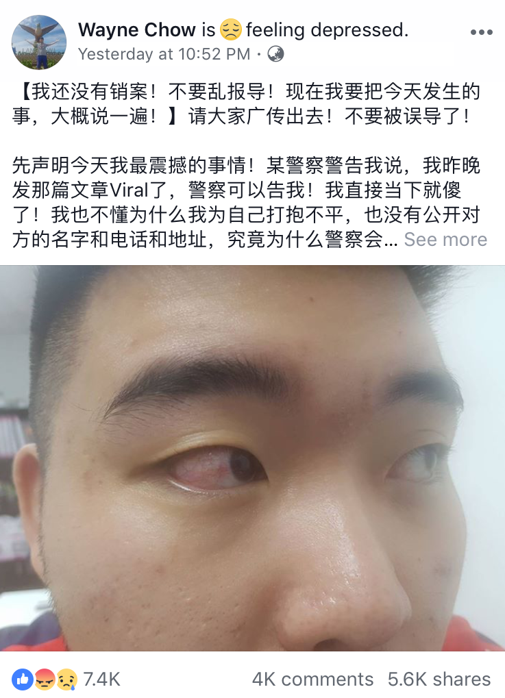 我只是一个22岁的男生。我懂什么鬼啊?我一个人进警察局,就被不断劝说,就说什么Viral可以告我?告我?告我?吓我?这算恐吓吗?我不知对方是否有背景还是不是有人帮忙了,但我真感觉得他有被偏袒。而且,打了人还能理直气壮?!?!那么厉害?我都不敢啦!