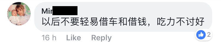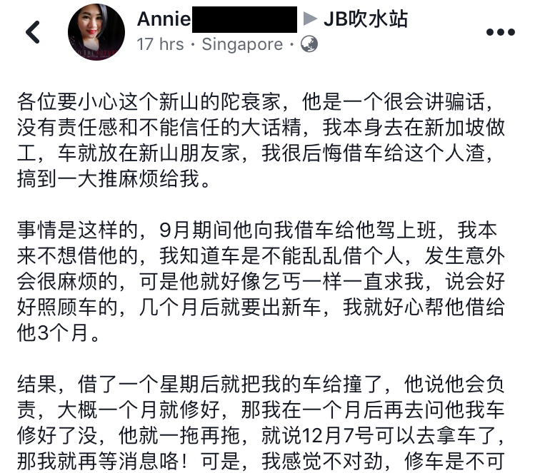 昨日有位女网友Annie 在JB吹水站分享了把车借给不负责任的男性朋友警惕网民要小心此人。