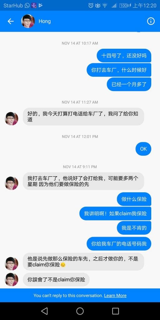 结果,借了一个星期后就把我的车给撞了,他说他会负责,大概一个月就修好,那我在一个月后再去问他我车修好了没,他就一拖再拖,就说12月7号可以去拿车了,那我就再等消息咯!可是,我感觉不对劲,修车是不可能两个月都还没做好的,过了7号后我就再去追问他,怎知道我无法联络他,WhatsApp/wechat/新加坡号码/马来西亚号码/messenger都无法联络上他,我真的没办法之下就去报案再去他家找他,
