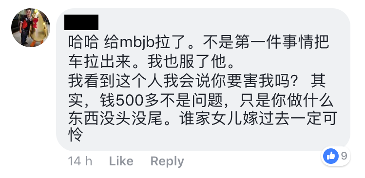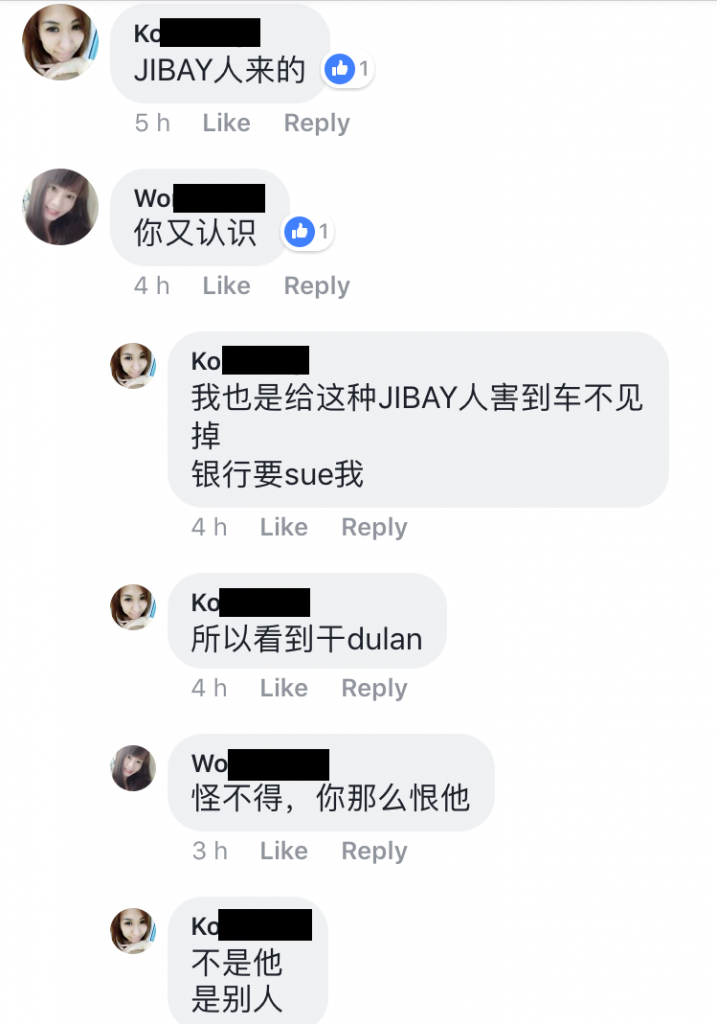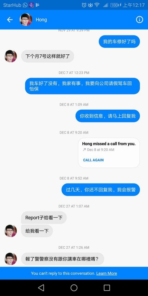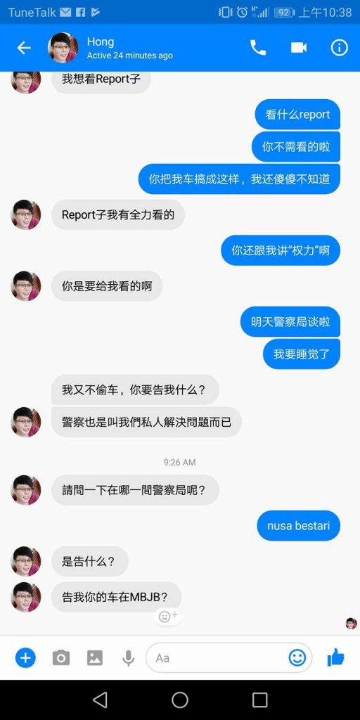 当我找他时,他都不出来面对,我就通知他“我已经报案,警察会上门找他”,然后我就走了,当我走了不久,他才fb messengere我,说我的车被mbjb拉去了。叫我直接去mbjb拿车就对了,报警也没用的警察也是叫你去mbjb那边的“。.哇佬!我当场崩溃了,