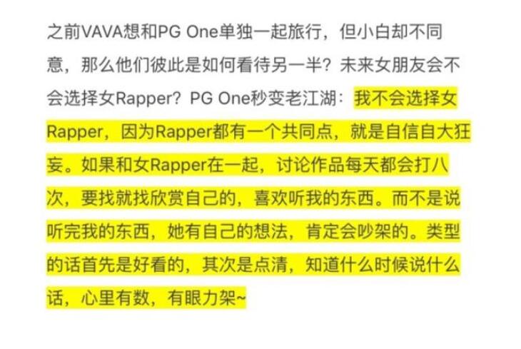 经过一段失败的感情经验后,PGone对自己的伴侣有了想法,不想谈恋爱因为觉得恋爱麻烦,对理想女孩希望对方是能欣赏他喜欢他歌的人,还要听完他的歌不要有自己的想法。讽刺的是,在婚姻中强势到女强男弱的李小璐竟是PG ONE的理想女孩。