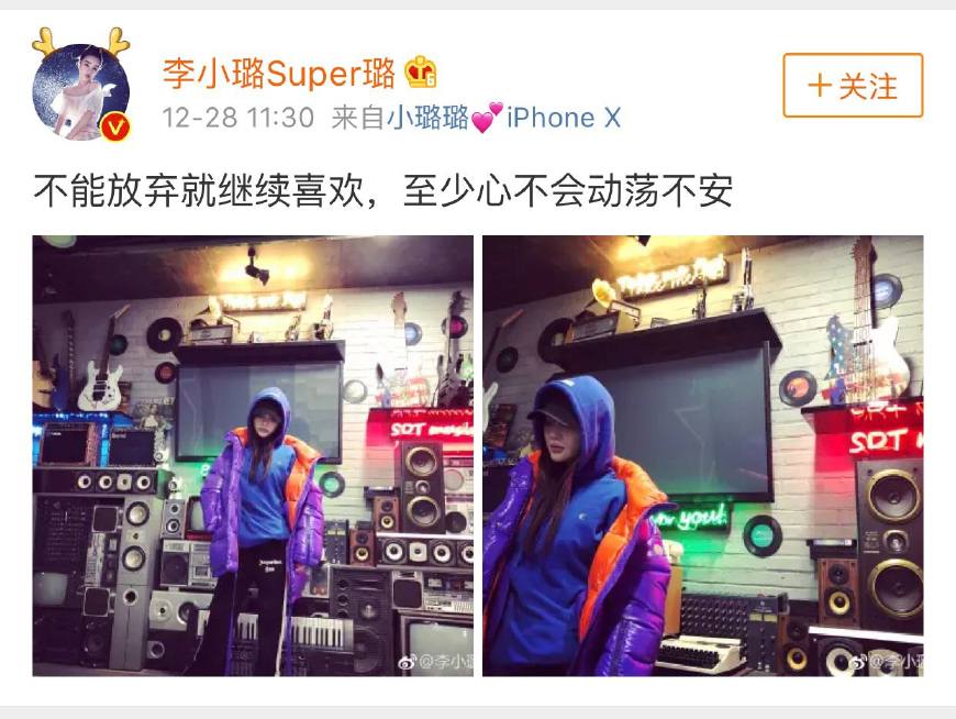 ▼而就在李小璐和PG One被拍的前一天,李小璐曾经发过这样一条图文,她说「不能放弃就继续喜欢,至少心不会动荡不安」,配的图片是她站在一排乐器前,穿着嘻哈风格的衣服。