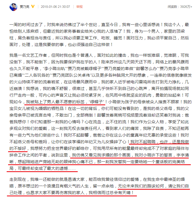 一个星期后,贾乃亮终于回应“李小璐”出轨事件,但是字里行间透露的无奈,似乎已经默认了李小璐出轨PG ONE。感觉很心疼亮哥。字字都很扎心!看完真的心疼贾乃亮、还有甜馨,也有一些网友更想痛骂李小璐不知道珍惜这么好的男人,看完贾乃亮写的长文,大家心里也都有答案了吧!
