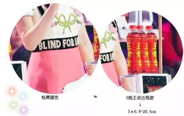 一瓶王老吉瓶宽在6.8釐米左右,再加上透视的因素,大幂幂的腰宽是完全小于20釐米的,生了孩子还能保持一尺九的少女腰,厉害了我的杨幂!