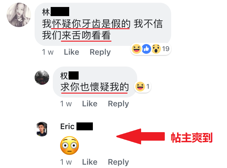 ▼ 应该是Eric的牙齿太白了,因此女网友也怀疑他的牙齿是假的所以要求舌吻看看。(舌吻能验牙齿真假吗?不是验舌头?)