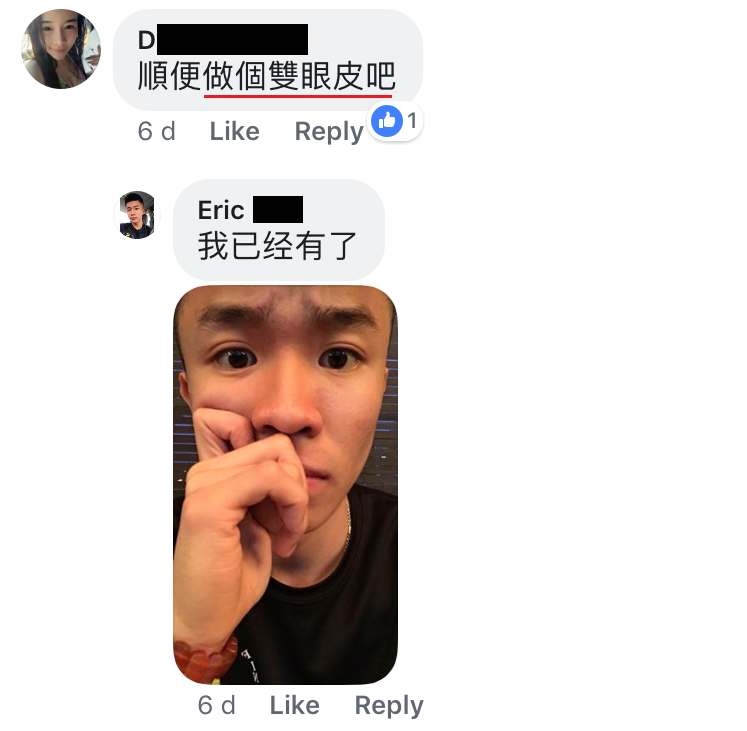 ▼有位女网友还建议Eric做个双眼皮,但Eric贴出了张大双眼能明显看到双眼皮的图。